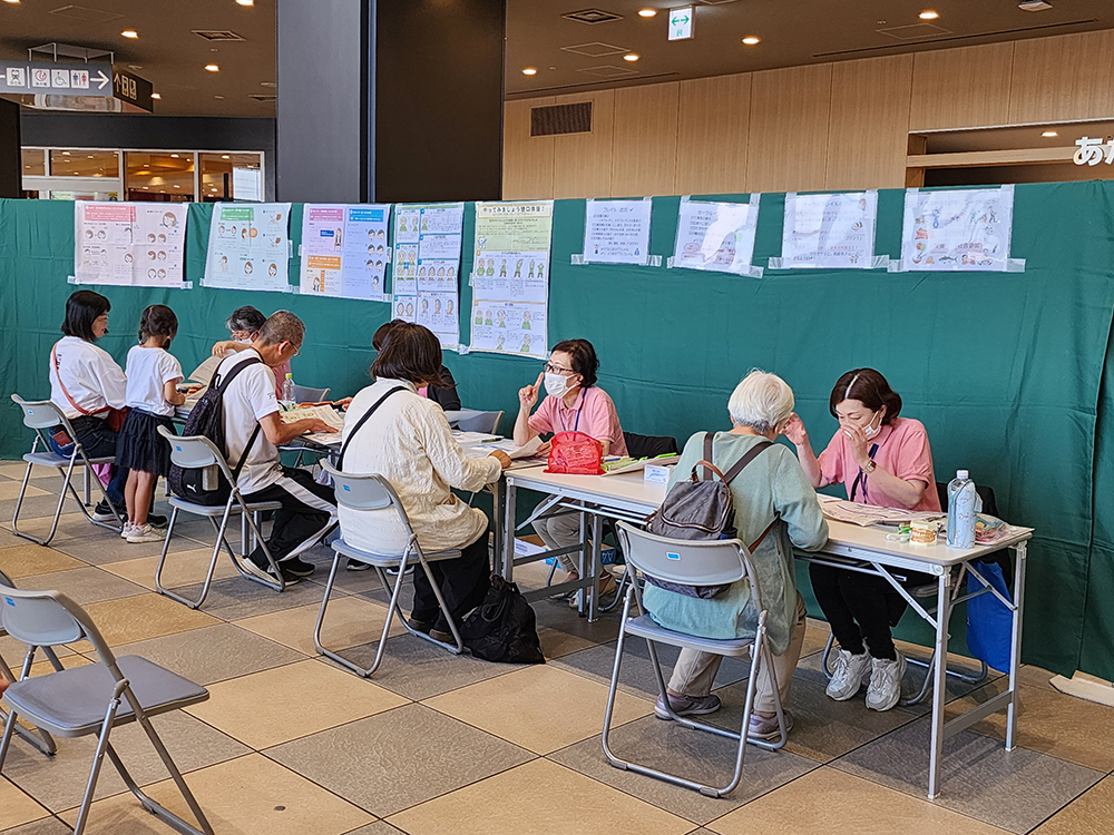 40歳以上を対象とした「お口の元気度チェック」(写真②)には43人が参加され、全身のおとろえ(フレイル)のサインとして注目が高まっている「オーラルフレイル」の判定方法となる滑舌などの検査を行い、お口の健康状態を説明しました。