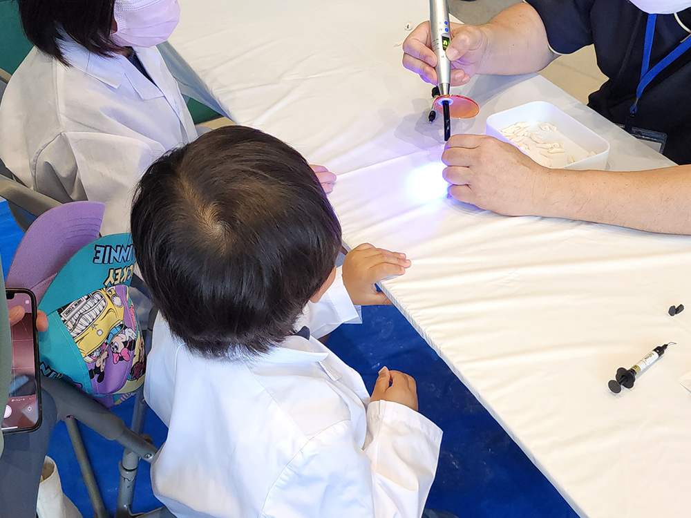 実際の材料を使ってむし歯治療が体験できる人気の「1日歯医者さん体験」(写真③)には178人のお子さんが参加され、保護者の方々がお子さんたちの白衣姿をカメラに収められていました。